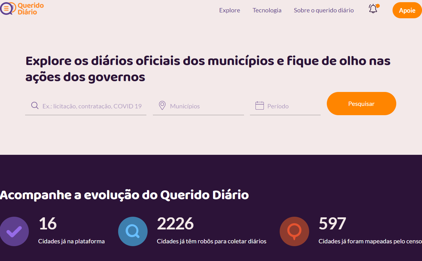 Página inicial da ferramenta Querido Diário, da Open Knowledge Brasil (Fonte: Querido Diário/Reprodução)