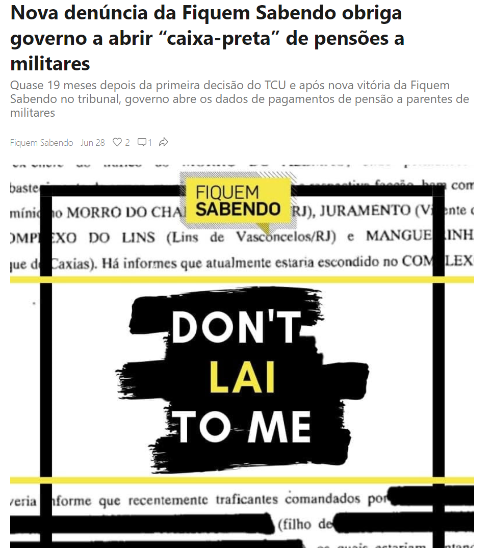EXCLUSIVO: Abrindo os dados de pensionistas e aposentados no Brasil- Don't LAI to Me #25 (Edição de aniversário de um ano!) (Fiquem Sabendo, 2020) - https://fiquemsabendo.substack.com/p/exclusivo-quem-so-e-quanto-recebem ↩︎